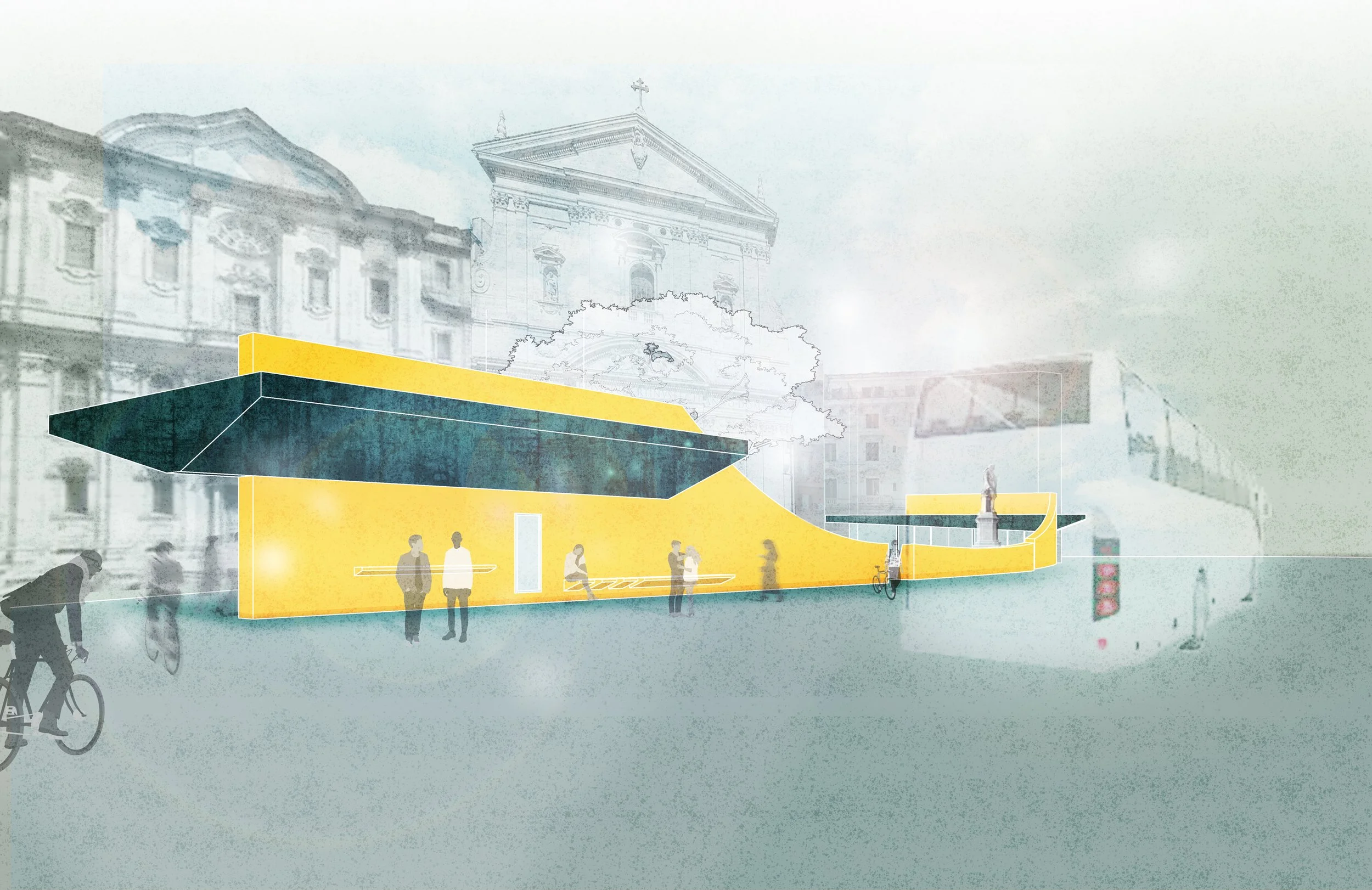 The Courtyard of Urban Mobility revitalized the existing Piazza della Chiesa Nuova in Rome, Italy. It brings life back to the site and encourages sustainable mobility through reduced traffic patterns, a re-designed bus stop, and the design of a bike rental facility for faster, more accessible mobility in the busy city of Rome.