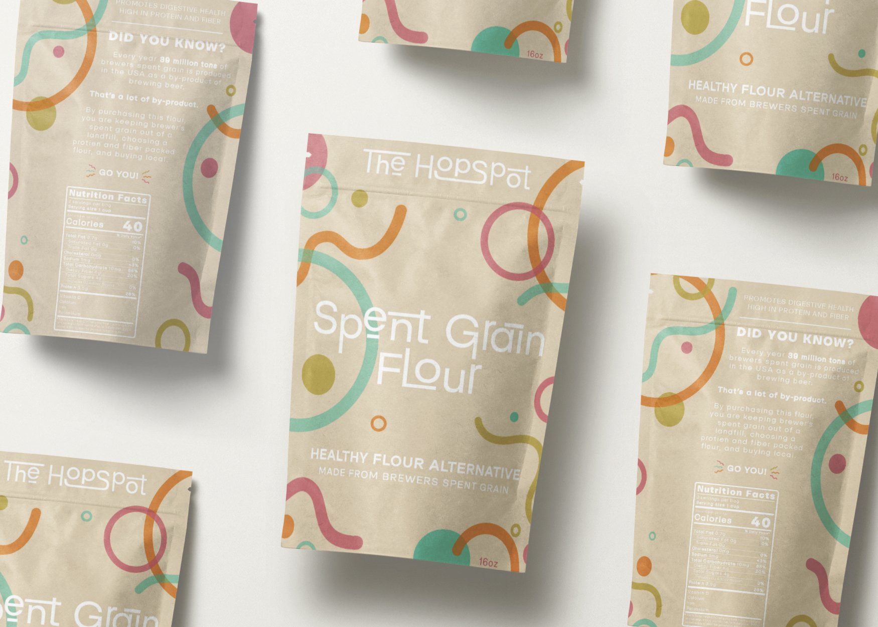 The project was built on the basis of a sustainable spent-grain flour business that is produced with the by-products of our locally brewed beer. Our Spent Grain Flour will be created to provide customers with numerous health benefits. The production of The Hopspot’s branded products allows for distribution to vendors where products can be sold outside of The Hopspot Brewing Co. Springdale location. The sustainable efforts of The Hopspot can bring recognition to the waste of by-products and an innovator in reusing spent grain in the brewing industry. The product packaging further reflects the bright, bold, and energetic atmosphere to be created within the brewery.